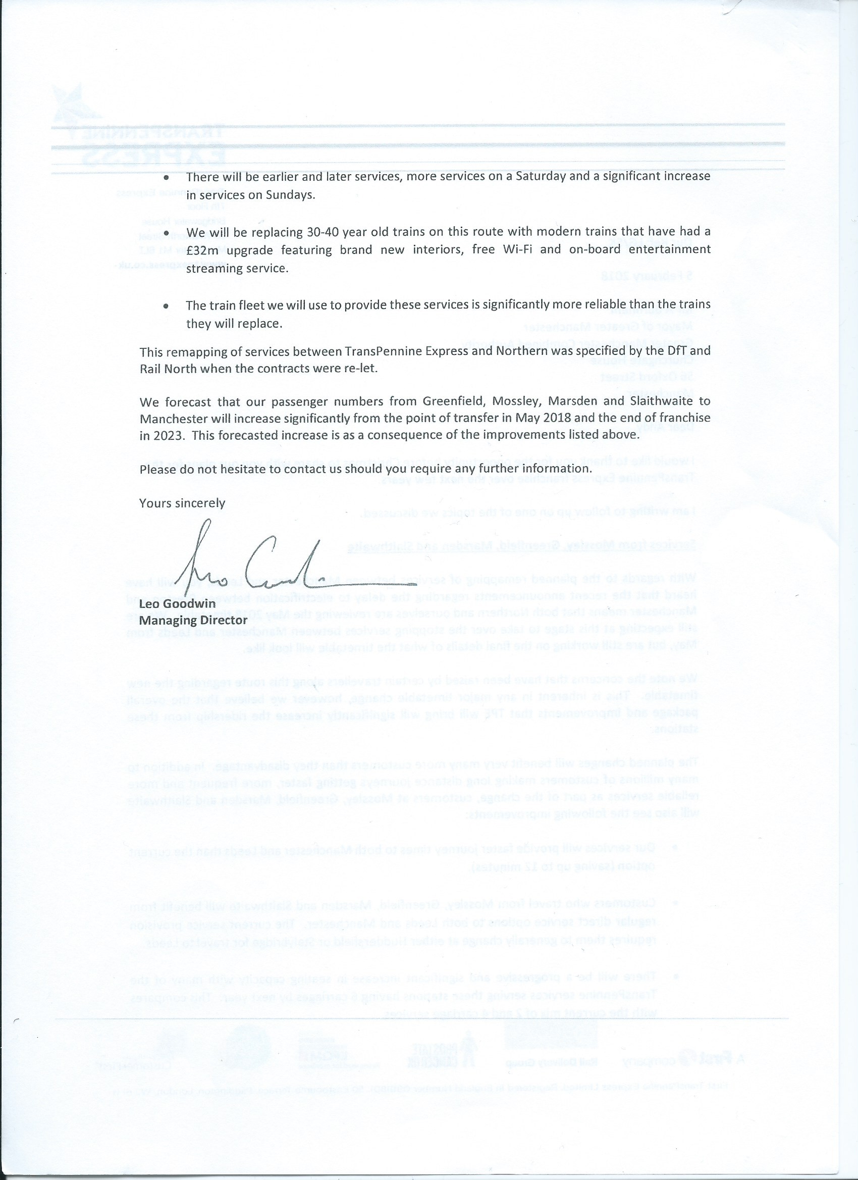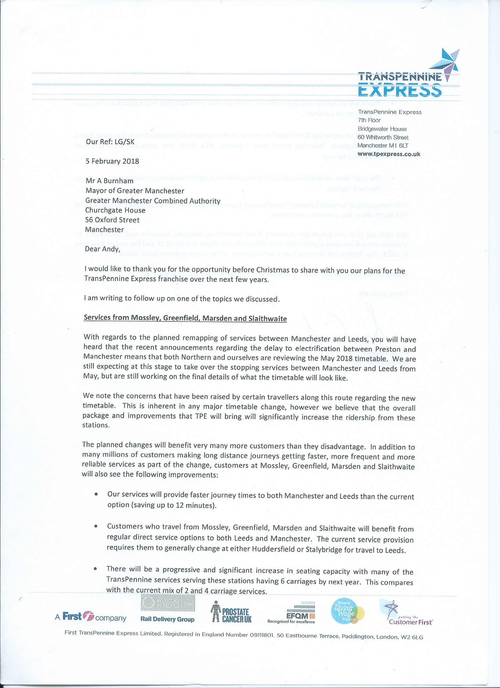 A letter from Leo Goodwin, Managing Director of TPE, to Andy Burnham before the timetable change.