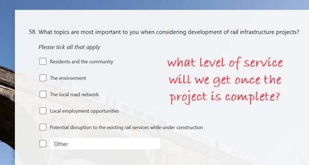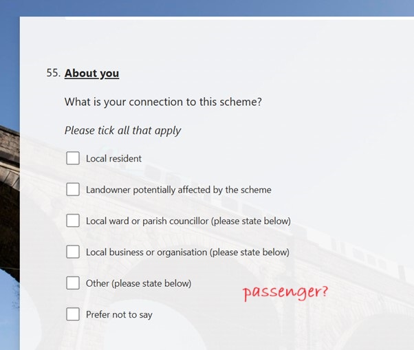 So what are the “substantial benefits to rail passengers and businesses in this area”? Nothing in this consultation attempts to answer that question. How can they expect to “take the public with them” when they don’t say what the scheme will deliver for the travelling public?